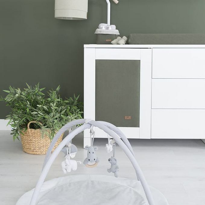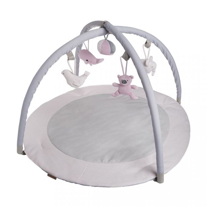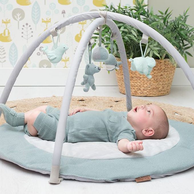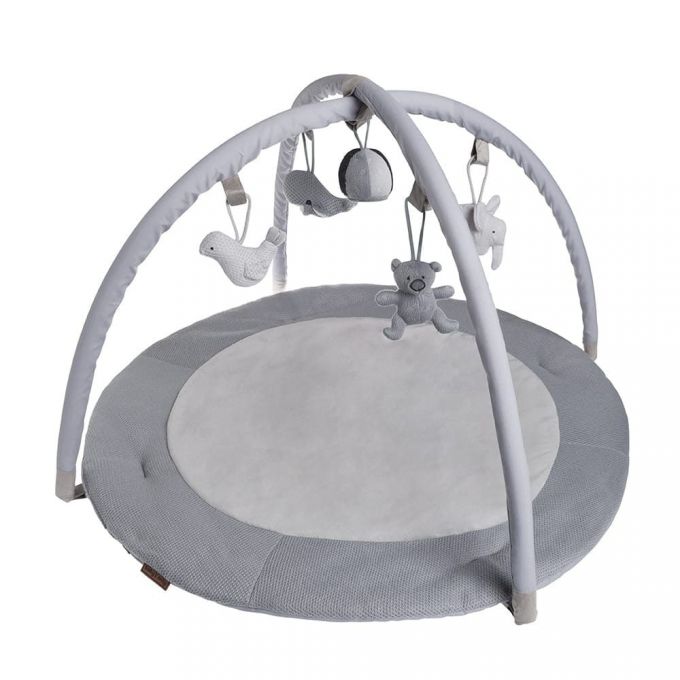 Esta alfombra de juego estimula los sentidos de su bebé; escuchar, ver y sentir! El tapete de juego consta de un tapete de juego redondo y dos arcos (extraíbles) que se pueden colocar fácilmente en su lugar. El tejido suave y un tejido de peluche aún más suave en la pieza central garantizan que su hijo se acueste cómoda y suavemente. Los famosos peluches de la colección cuelgan en versión mini de los dos arcos de juego. Mucha diversión garantizada