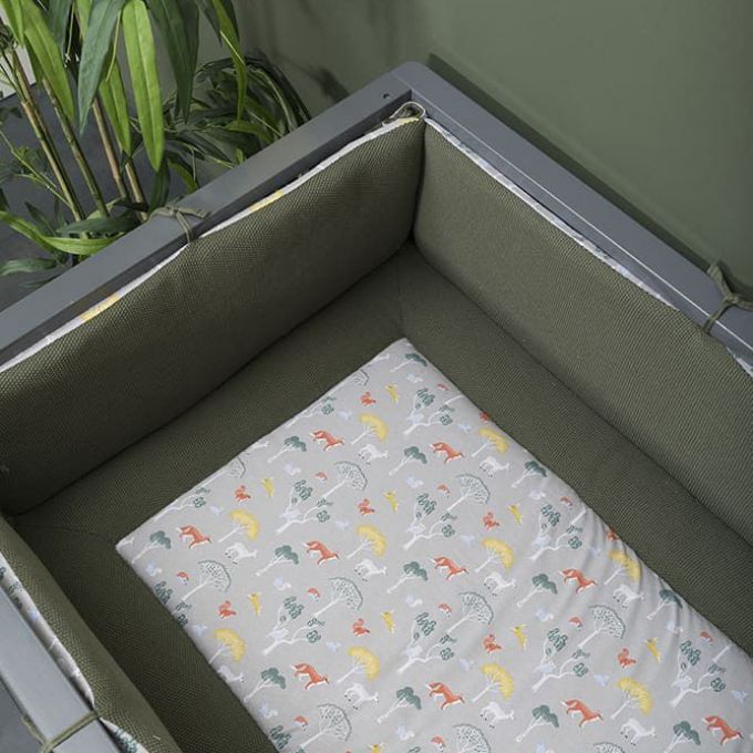 La alfombrilla del parque combina a la perfección con accesorios como el parachoques del parque y la caja de música de la colección Forest.