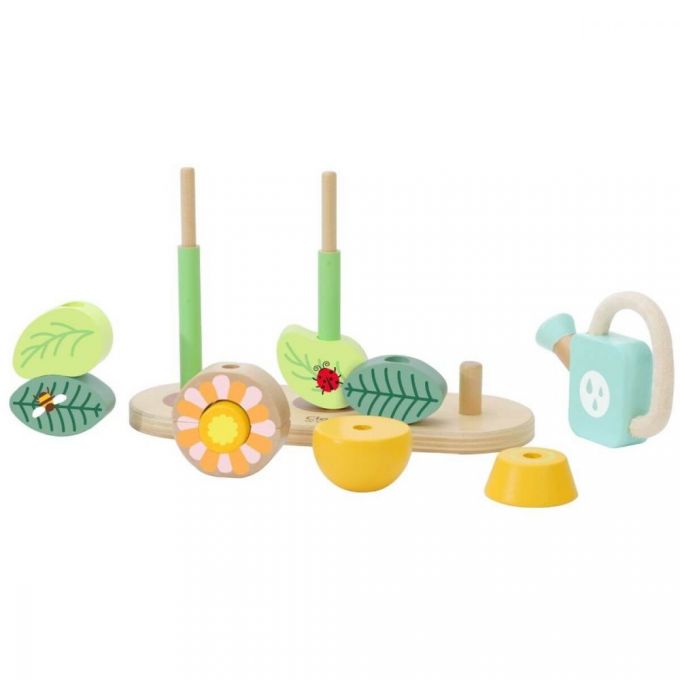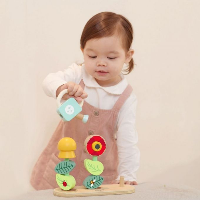 Apilable de madera de preciosos tonos pastel con elementos propios del jardín (flores, hojas, pétalos, regadera). Diseñado para desarrollar la motricidad fina, el reconocimiento de formas y aprender sobre el mundo natural.
