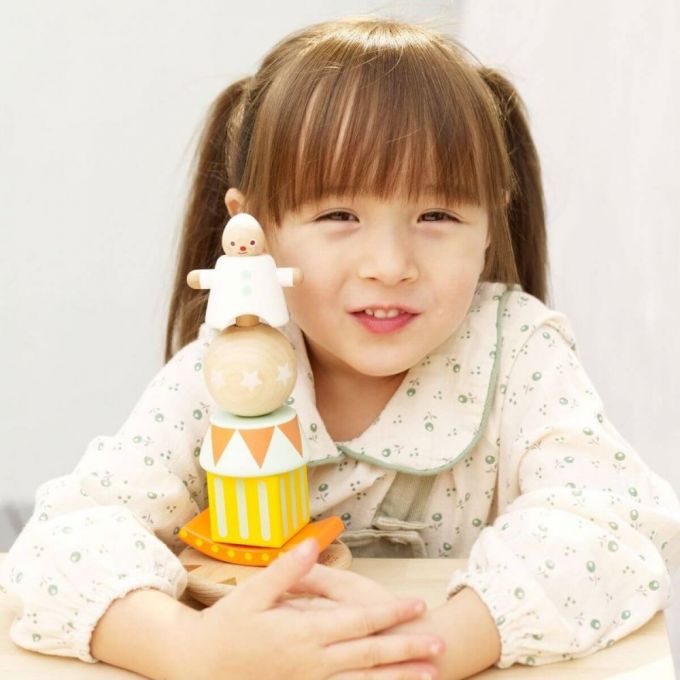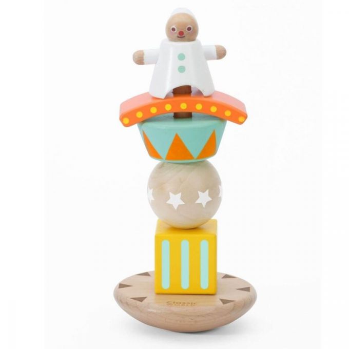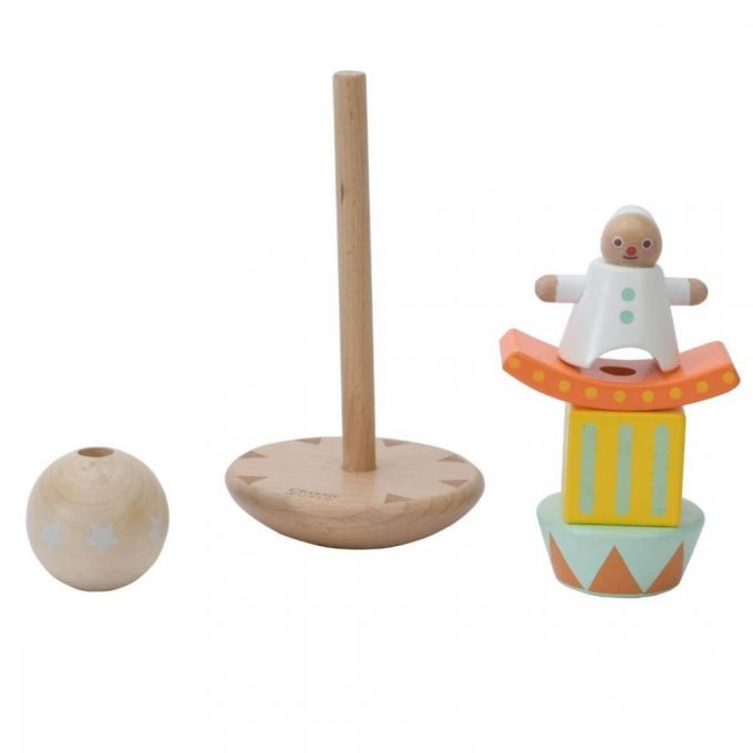 Apilable formado por piezas de madera de distintas formas geométricas y un payaso. Las piezas se pueden apilar de múltiples formas, creando cada vez una torre diferente. Desarrolla la coordinación ojo - mano y las motricidad fina.