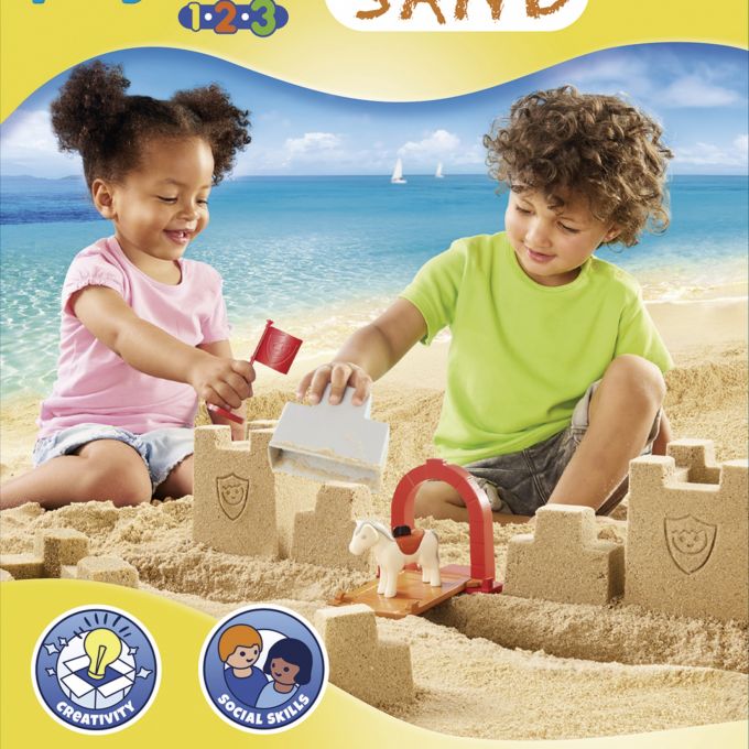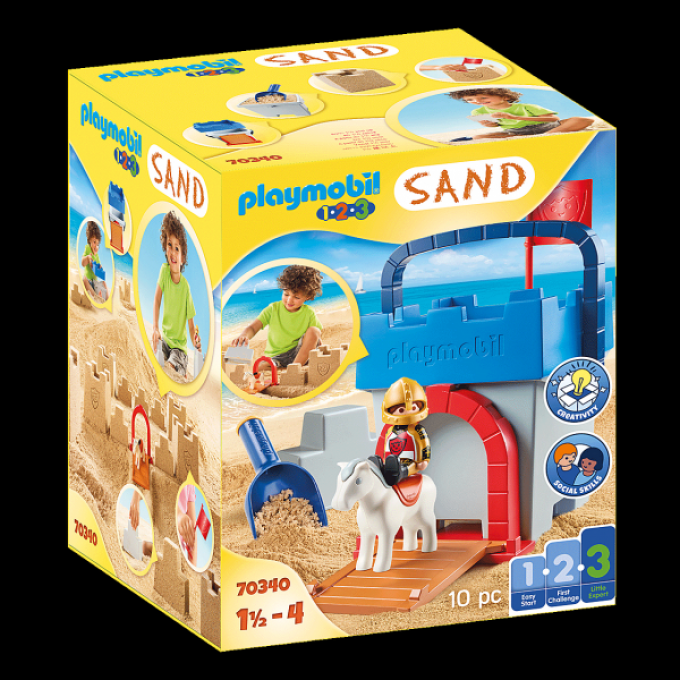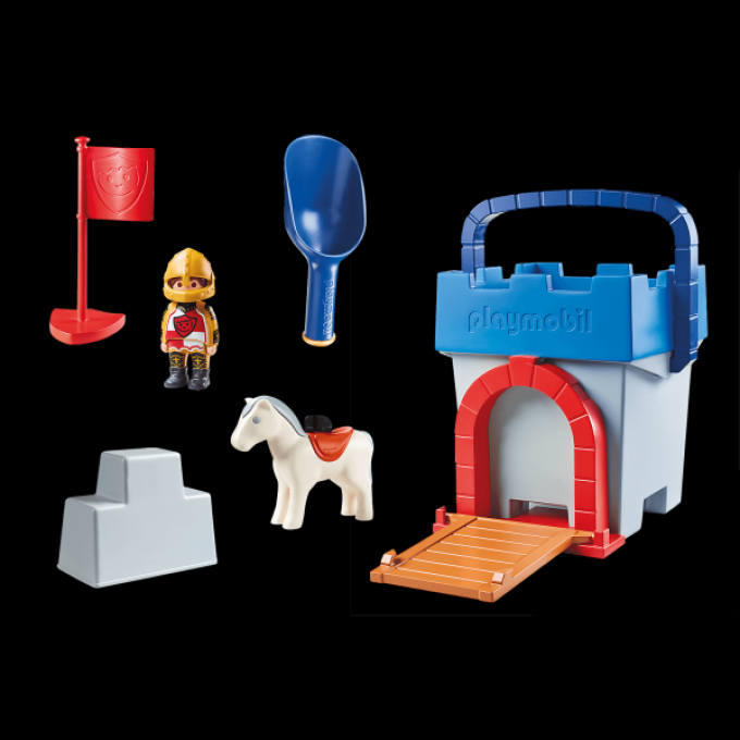 Este juego creativo se compone de cubo, cucharón, pala, tamiz, moldes "muro castillo", puerta del castillo con puente levadizo y sello "escudo de armas del caballero". Con figuras PLAYMOBIL 1.2.3 caballero y caballo.
