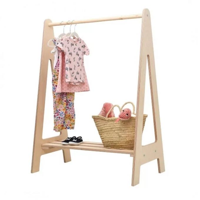 El armario / burrito de Mobo hace las funciones de perchero y zapatero. Consta de una barra donde poder colgar la ropa de tu hijo y balda inferior para colocar cajas o zapatos.