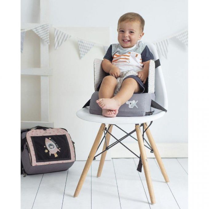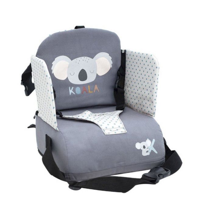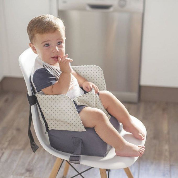 Este asiento elevador portátil es plegable, ligero y con asa regulable para transportarlo. Cuenta con un arnés de seguridad ajustable que sujeta al niño firmemente en el asiento y prácticos bolsillos para guardar baberos, juguetes, etc. La correa de seguridad permite instalar el asiento en la mayoría de sillitas estándar, y se convierte en una correa para colgar en el hombro en forma de bandolera o en la espalda como mochila.