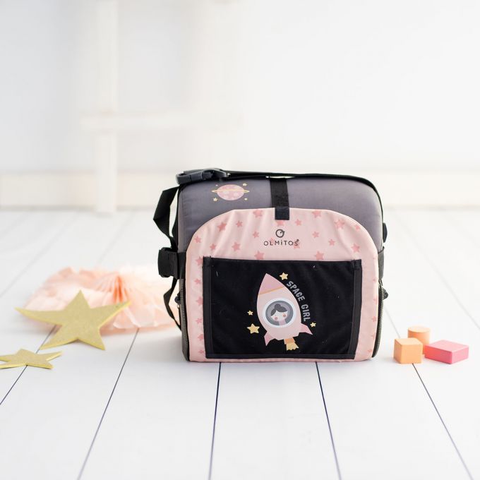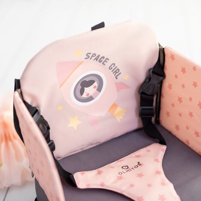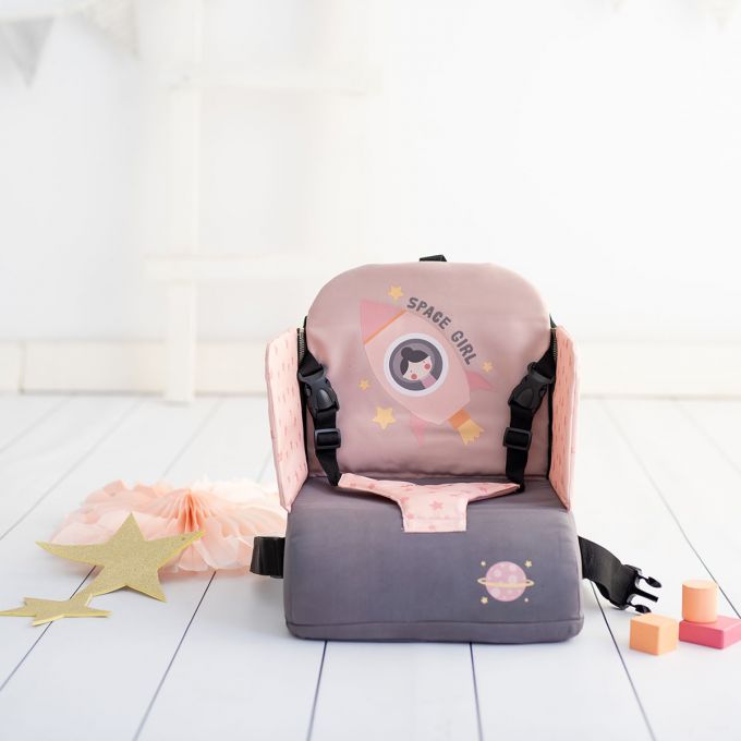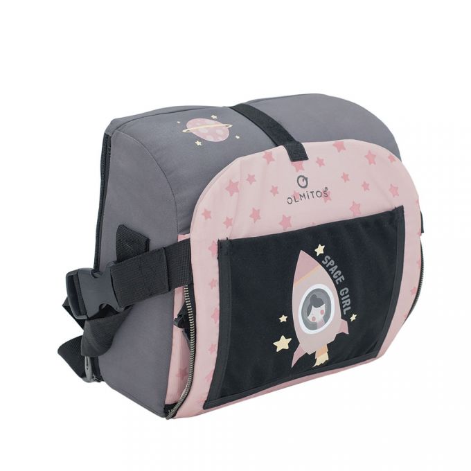 Este asiento elevador portátil es plegable, ligero y con asa regulable para transportarlo. Cuenta con un arnés de seguridad ajustable que sujeta al niño firmemente en el asiento y prácticos bolsillos para guardar baberos, juguetes, etc. La correa de seguridad permite instalar el asiento en la mayoría de sillitas estándar, y se convierte en una correa para colgar en el hombro en forma de bandolera o en la espalda como mochila.