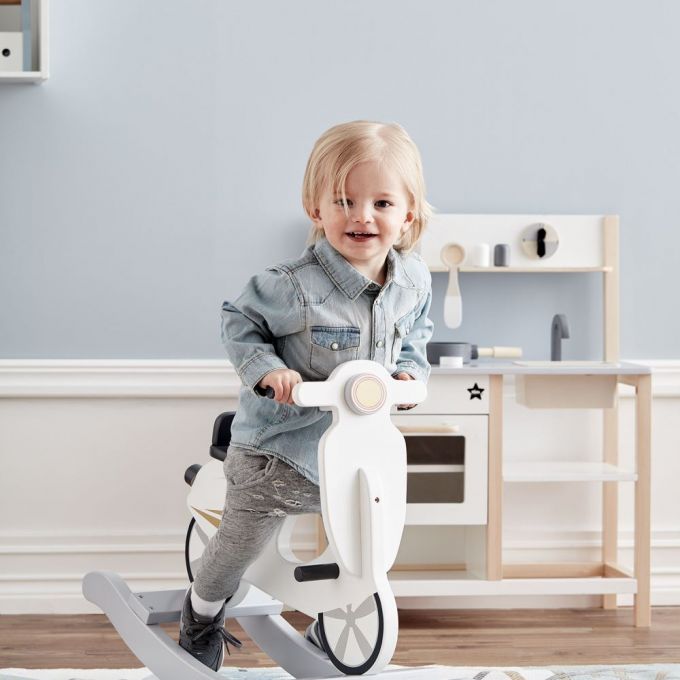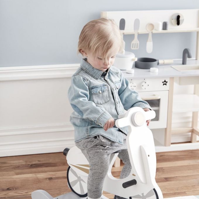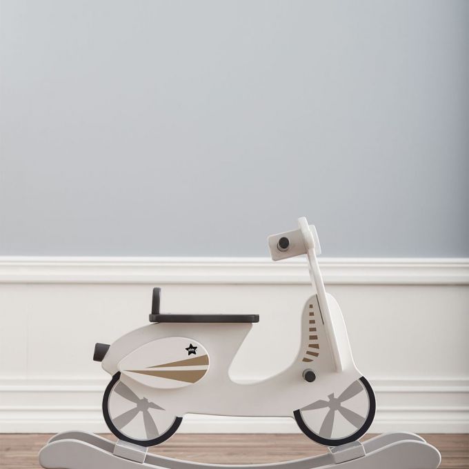 Precioso scooter balancín en forma de una vespa antigua. Realizada en matera y pintada en diáfanos colores blanco con detalles en negro. Queda maravilloso en el cuarto de los pequeños, y ellos se divertirán mucho montando este bonito juguete. El scooter tiene rieles antideslizantes y manijas estables para aferrarse.