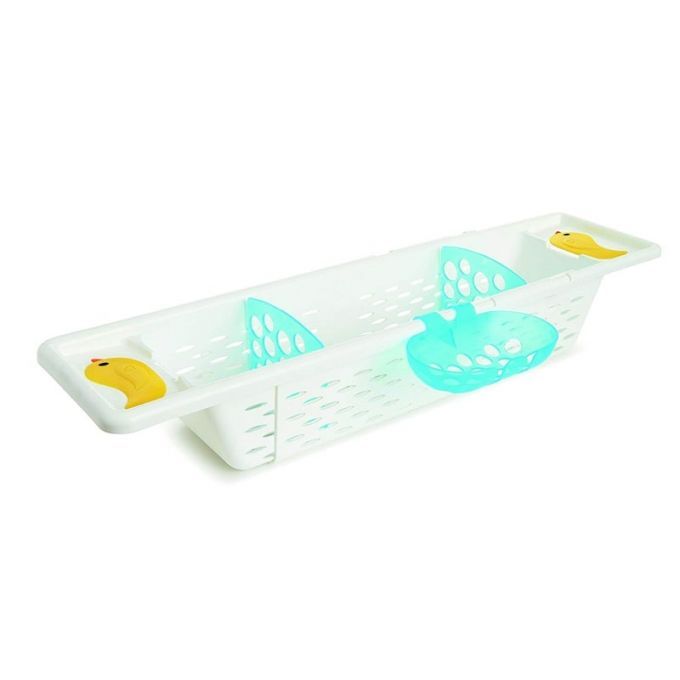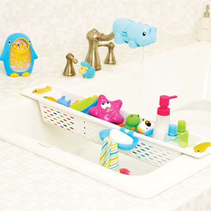 Sus dos separadores ajustables te permiten personalizar el espacio disponible para los juguetes y los productos de baño. Y además, si lo colocas entre el niño y los grifos, ayudará a evitar golpes y quemaduras. Cuando se termine el baño, no tienes más que deslizar el organizador hasta la parte de atrás de la bañera para usar la ducha.