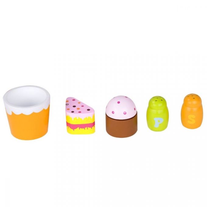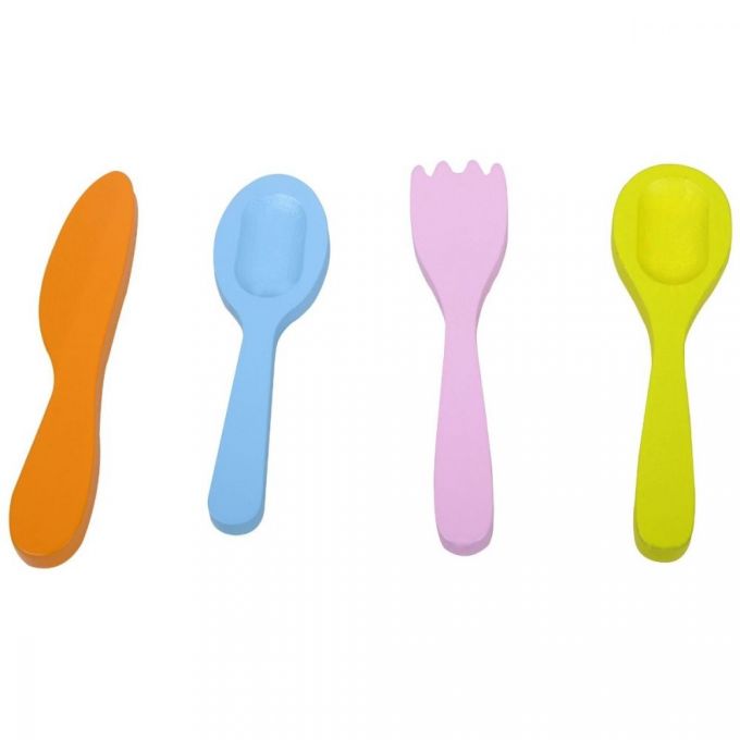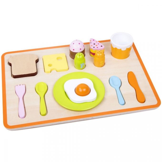 La bandeja de desayuno promueve el juego de roles y la creatividad, incluye distintos elementos del desayuno como son: 1 tenedor, 1 cuchillo, 2 cucharas, 1 tostada, 1 plato con 1 huevo frito, 1 porción de mantequilla etc.