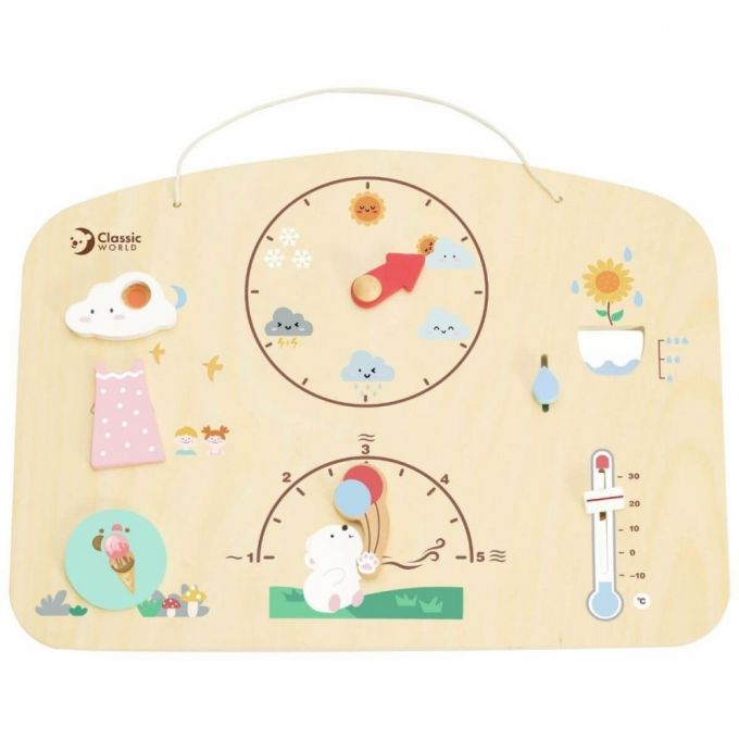 Panel con distintos elementos para identificar el tiempo que hace cada día (soleado, lluvioso, con nieve, etc). Puedes ir colocando las distintas piezas para interiorizar el paso de las estaciones y la ropa asociada a cada una de ellas.