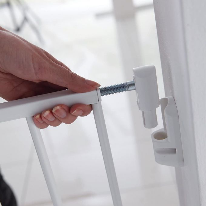La barrera es de color blanco, tan versátil como elegante, está hecha de resistente acero y se fija directamente a la pared; cuenta con un sistema de apertura en dos sentidos y una abertura de paso extra ancha sin barra inferior que franquear.
