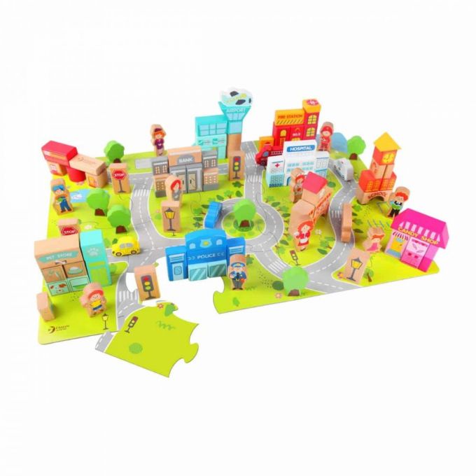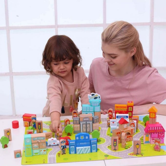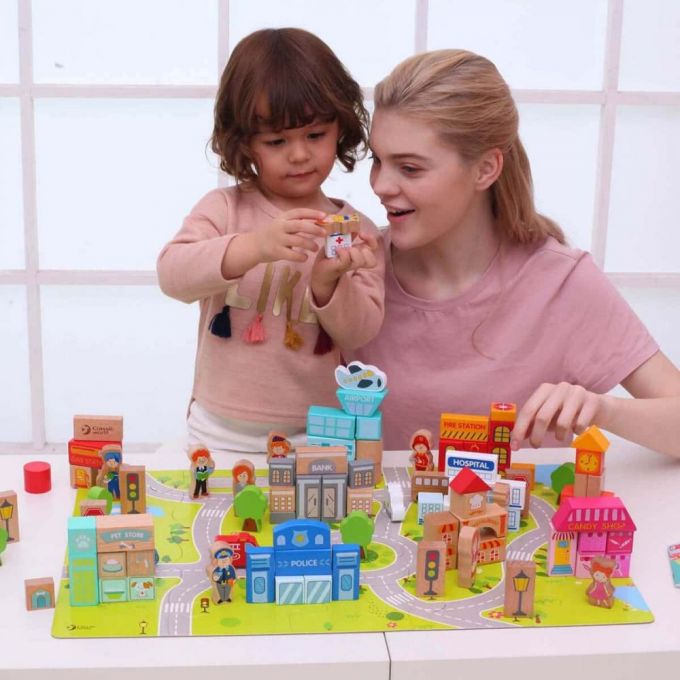 Bloques de construcción ciudad incluye: 20 piezas rompecabezas y 100 bloques con diferentes edificios, figuras de personas, letras, números y símbolos matemáticos que se pueden agregar a la ciudad. El juego de bloques puede ayudar a desarrollar la creatividad y la coordinación ojo-mano de los peques.
