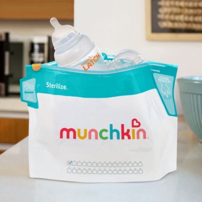 Con las bolsas de esterilización™ CIERRE HERMÉTICO™ de Munchkin podrás eliminar el 99.9% de las bacterias que se hayan en los biberones, tetinas, chupetes, mordedores, juguetes pequeños y en los accesorios de los sacaleches cuando estás de viaje. Tan solo tienes que llenar la bolsa con los pequeños artículos de alimentación del bebé, añadir agua, poner en el microondas y ¡con el vapor a toda vela lograrás una limpieza totalmente higiénica! El paquete incluye seis bolsas y cada una puede utilizarse hasta 30 veces. Las bolsas vienen con unos cuadrados que podrás marcas después de cada ciclo de vapor para que lleves un seguimiento de las veces que las has usado. Y para que no te quemes los dedos, cada bolsa tiene un asa Toque-Frío™ para manipularlas fácilmente y un respiradero por donde puede escapar el vapor. Limpieza segura para el bebé, fácil y natural.