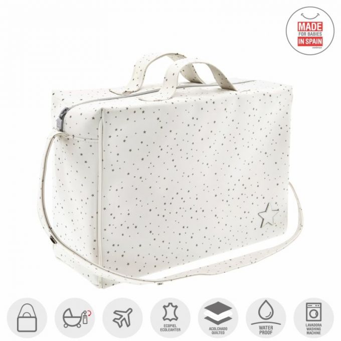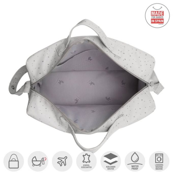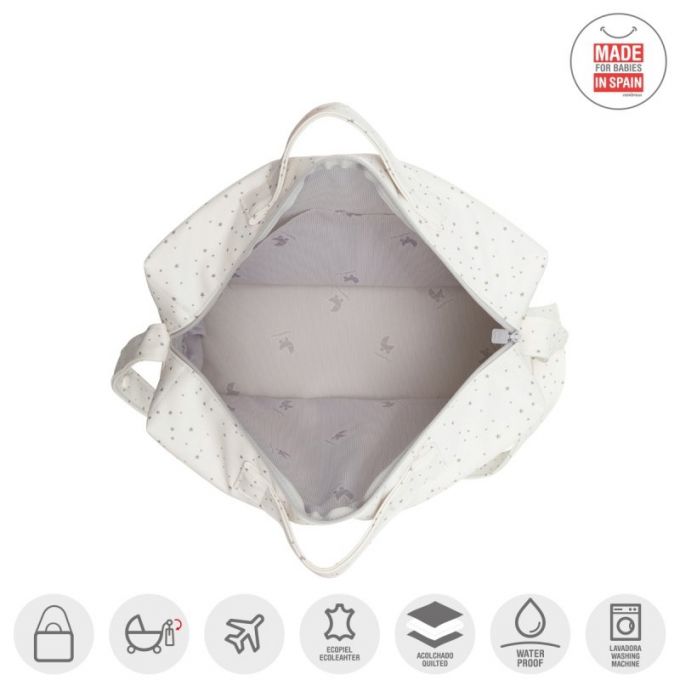 El bolso Tabela de Cambrass, tiene unas medidas ideales de 17 x 43 x 26 cm, para poder organizar todo lo necesario para el bebé, tiene 2 asas en la parte superior para poder cogerlo fácilmente y una bandolera que lleva clips para poder utilizar en el carro. En su interior lleva bolsillos para poder organizar todo lo que el bebé necesita para salir a la calle.