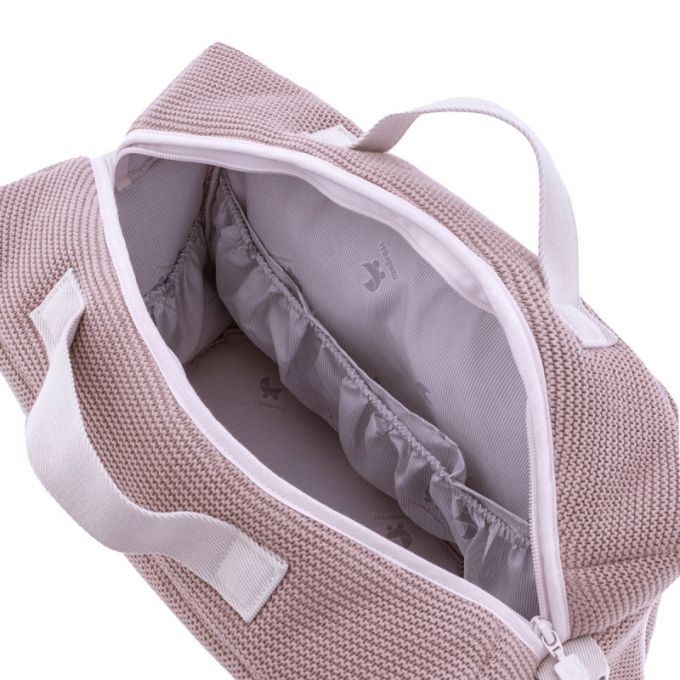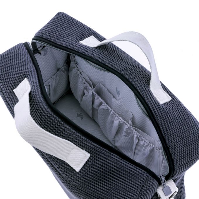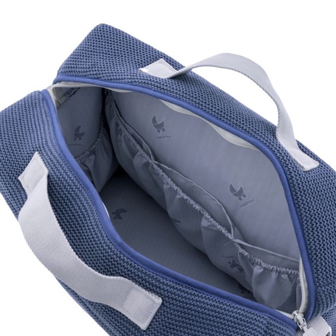 En su interior lleva bolsillos para poder organizar todo lo que el bebé necesita para salir a la calle. Su relleno es de fibras especiales para mantener su estructura después del lavado. Made in Spain.