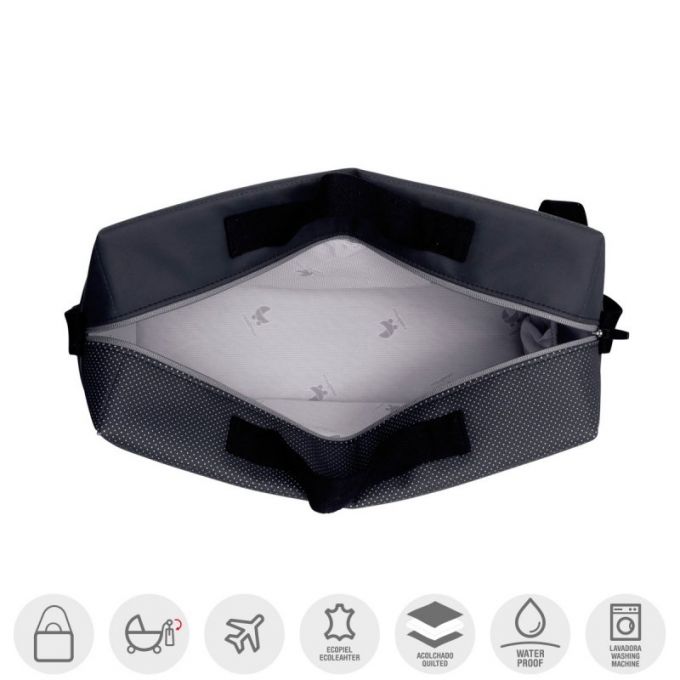 En su interior lleva bolsillos para poder organizar todo lo que el bebé necesita para salir a la calle. Su relleno es de fibras especiales para mantener su estructura después del lavado. Made in Spain.
