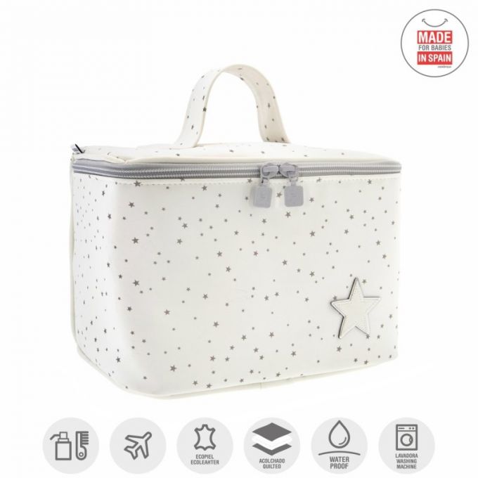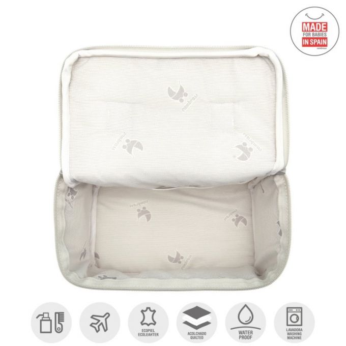 El Bolso Vanity de Cambrass es de uso maternal y sirve para transportar los productos necesarios de uso diario para el bebé. Sus bolsillos interiores permiten guardar los objetos de menor tamaño. Cuenta con un asa superior de 30 cm. para poder llevarlo fácilmente en la mano. Además su cierre con cremallera YKK de alta calidad garantiza una larga duración.