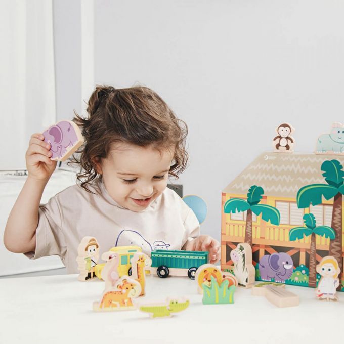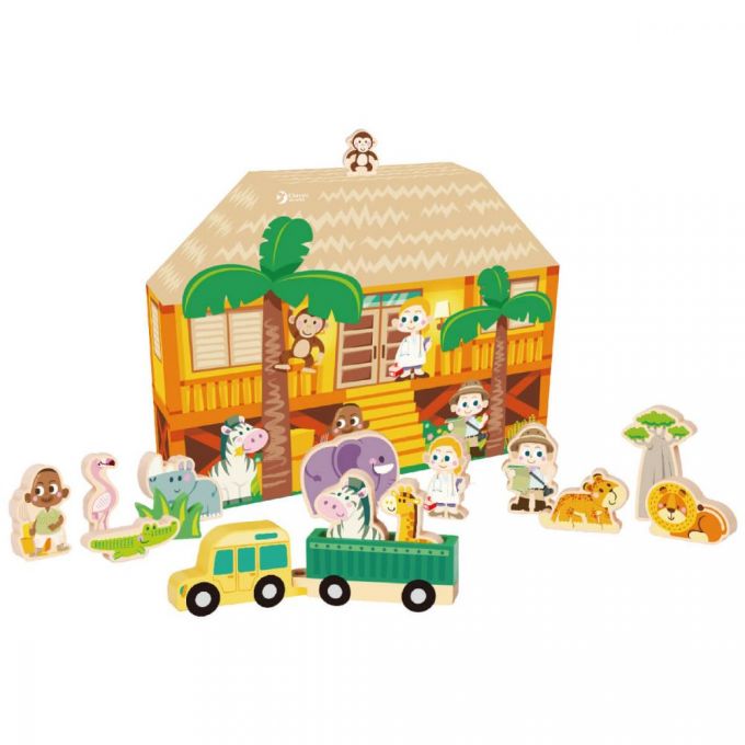 La caja de juego safari en la selva es una caja de cartón grueso que sirve de escenario tanto interior como exterior para inventarse las aventuras que tu hij@ quiera mientras juega con las distintas figuras de madera. Fomenta la imaginación y creatividad.