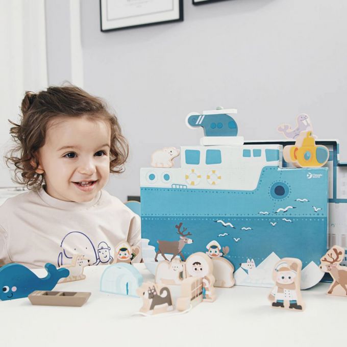 La caja de juego viaje al ártico es una caja de cartón grueso que sirve de escenario tanto interior como exterior para inventarse las aventuras que tu hij@ quiera mientras juega con las distintas figuras de madera. Fomenta la imaginación y creatividad.