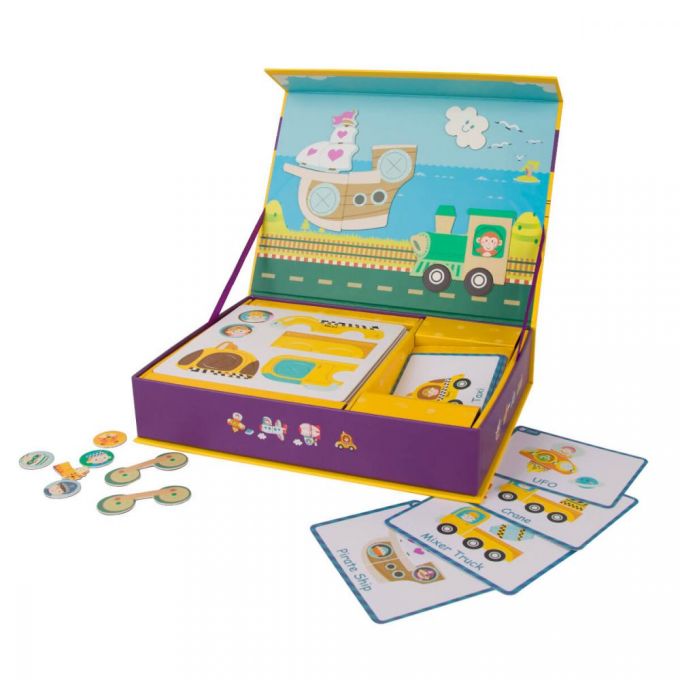 Caja magnética transporte, incluye hasta 12 tipos de transporte los cuales podrás construir uniendo las distintas piezas imantadas. Tu hij@ podrá guiarse por las tarjetas o inventarse distintos transportes.