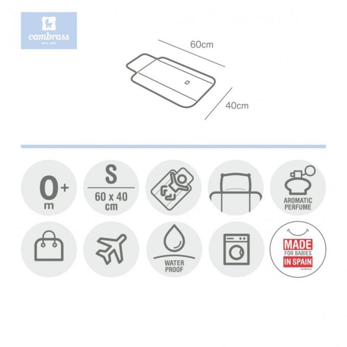 El Cambiador de viaje de Cambrass, de 60 x 40 cm., garantiza el confort del bebé y permite que su cambio en cualquier lugar sea rápido y práctico. Es fácilmente plegable mediante velcro y supone un artículo indispensable en el bolso maternal ya que en cualquier momento y lugar se puede requerir su utilización. El interior acolchado proporciona un confort extra al bebé y evitan posibles golpes o movimientos bruscos que se podrían producir al dejar al bebé sobre cualquier superficie dura y rígida. Además, su interior está acabado con un tejido impermeable perfumado muy fácil de limpiar.