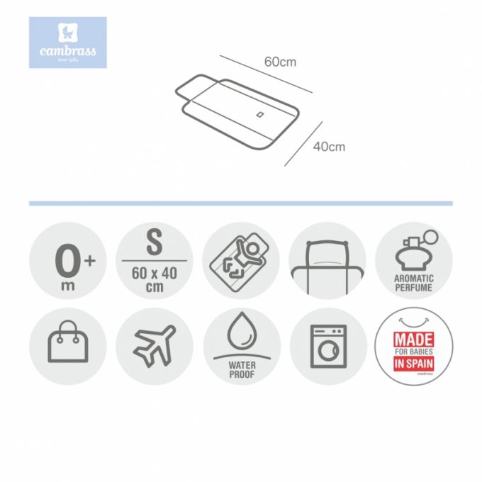 El Cambiador de viaje de Cambrass, de 60 x 40 cm., garantiza el confort del bebé y permite que su cambio en cualquier lugar sea rápido y práctico. Es fácilmente plegable mediante velcro y supone un artículo indispensable en el bolso maternal ya que en cualquier momento y lugar se puede requerir su utilización. El interior acolchado proporciona un confort extra al bebé y evitan posibles golpes o movimientos bruscos que se podrían producir al dejar al bebé sobre cualquier superficie dura y rígida. Además, su interior está acabado con un tejido impermeable perfumado muy fácil de limpiar.