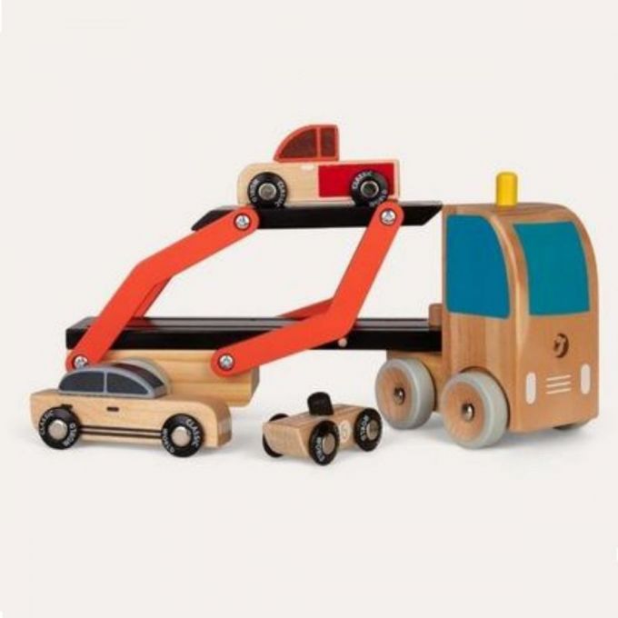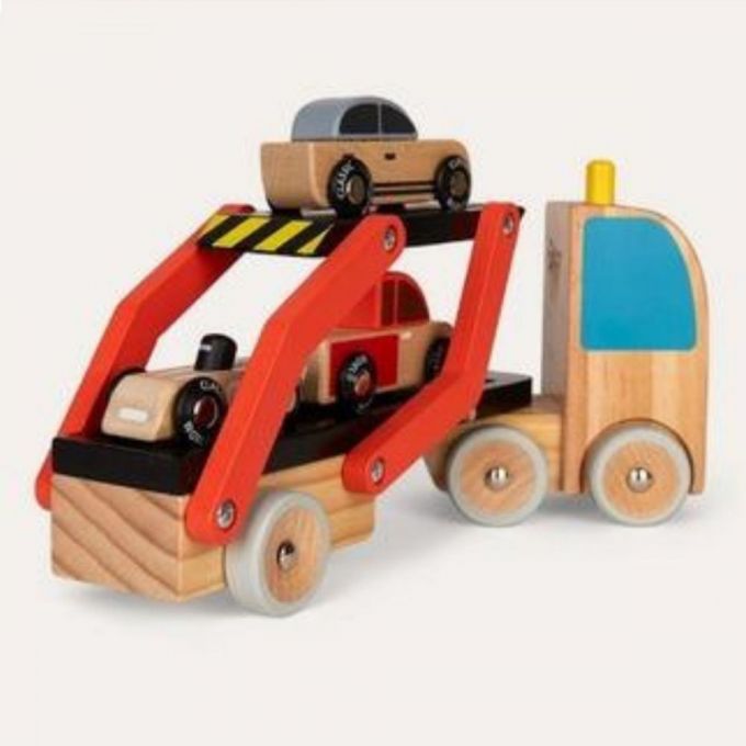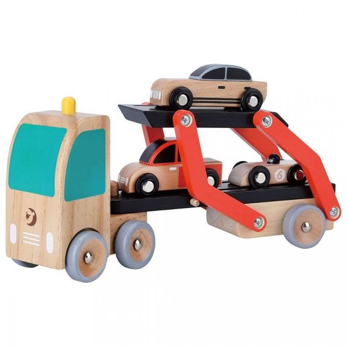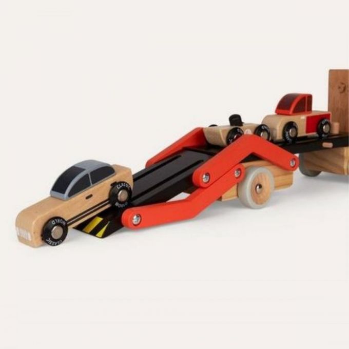 El camión remolque con coches transporta los vehículos en la cubierta para ir al siguiente destino. Este juguete de madera imita el proceso de carga y descarga de un camión transportador. Al bajar el nivel, la segunda plataforma funciona como una rampa para que los coches suban al camión, al levantar el nivel, se convierte en un completo sistema de dos pisos.