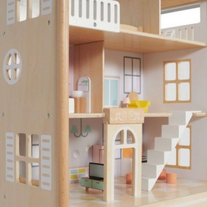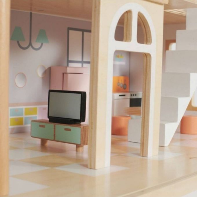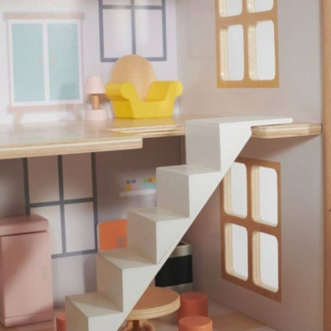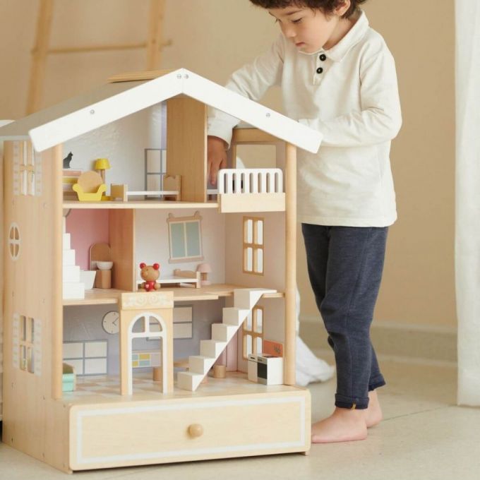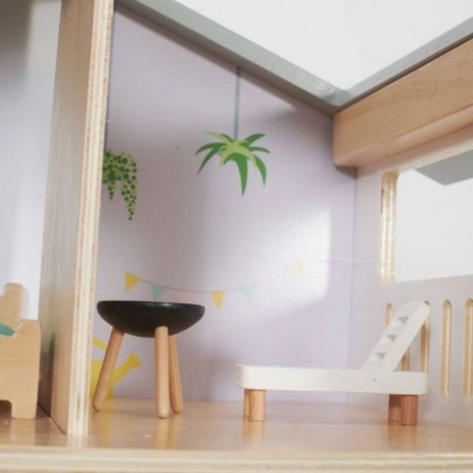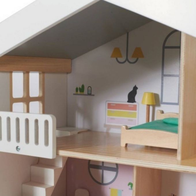 Gran casa de madera en preciosos tonos pastel con múltiples estancias: sala de estar, cocina, dormitorio, lavabo y un balcón para hacer barbacoas. Incluye el mobiliario y dos muñecos (hombre y mujer), que pueden guardarse en el cajón que hay en la base de la casa.