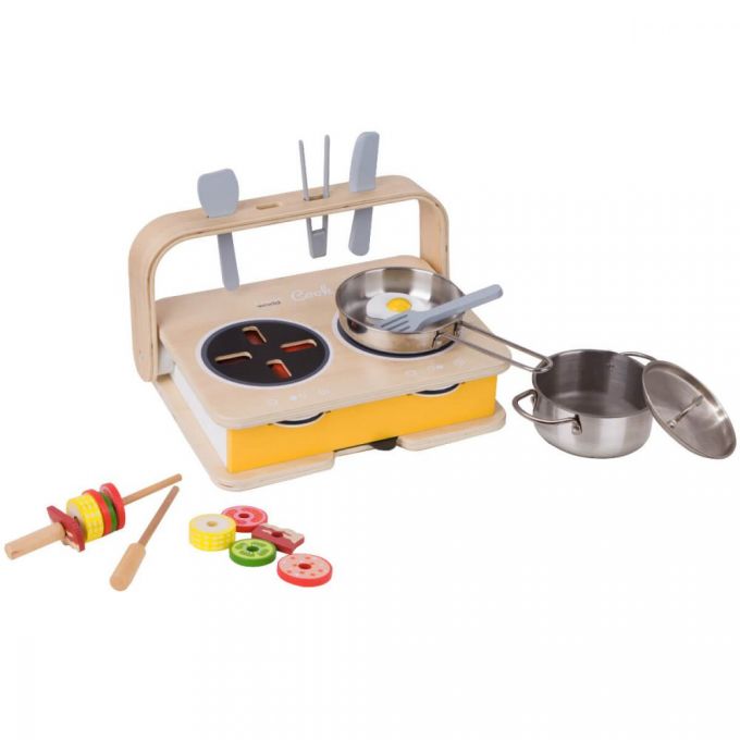 La cocina de sobremesa 2 en 1 portátil es una una cocina de mesa portátil pequeña para facilitar su transporte con distintas funciones en los 2 lados. Por un lado, l@s niñ@s pueden jugar a cocinar una comida con los fogones y por el otro lado jugar con la parrilla con parrilla. En ambos lados, los niñ@s pueden hacer las llamas de diferentes tamaños a través de una rueda giratoria. El asa sirve para transportar la cocina fácilmente y para guardar los utensilios cuando se juega.