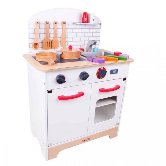 La cocina del chef es una cocina moderna multifuncional con la que tu hij@ aprenderá a cocinar las mejores recetas. Es lo suficientemente grande para jugar con amig@s, desarrollando sus habilidades de comunicación y socialización. Incluyen diferentes accesorios de madera para fomentar un juego de roles fácil y divertido como son: alimentos para lavar, cortar y cocinar, utensilios de cocina, sal para agregar sabor.