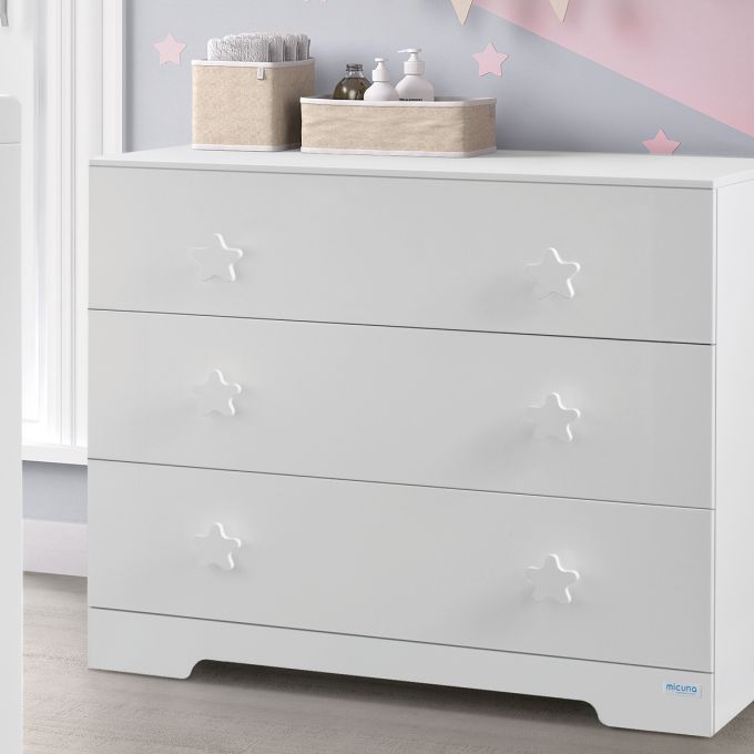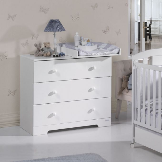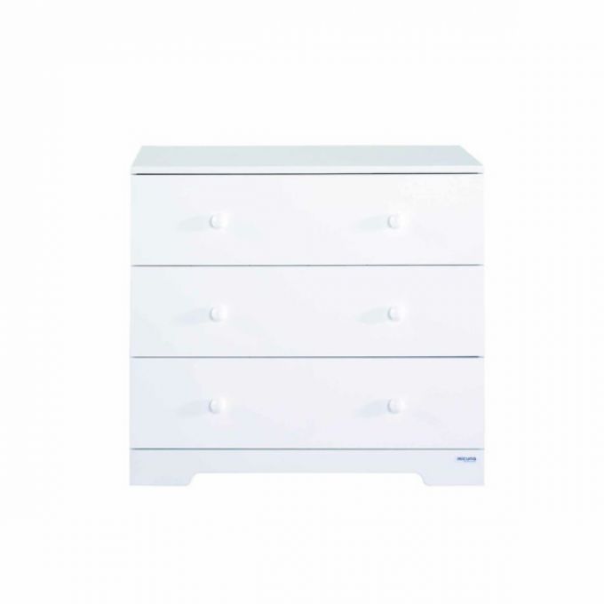 Con diseño liso y tiradores redondos, tres amplios cajones y disponible en color blanco.