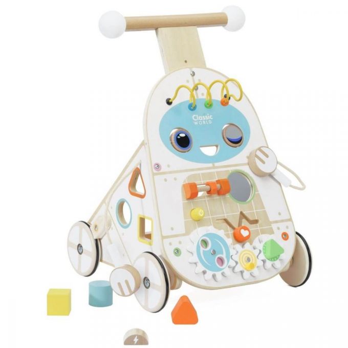 Correpasillos de madera con forma de robot. Los brazos articulados son imantados y pueden colocarse en distintas posiciones. La altura del correpasillos es regulable e incluye un regulador de velocidad para que caminar con él sea más seguro. En sus distintas caras incluye diversas actividades: xilófono, encajable de formas, ruedas para girar, espejo... En la parte posterior tiene un compartimento para llevar objetos.