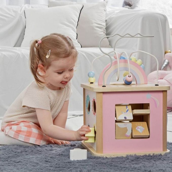 Cubo de actividades unicornio es un bonito cubo de actividades como laberintos, encajables, puzzles, con el que jugará durante horas. Ayuda a desarrollar la coordinación ojo-mano y las habilidades de observación de tu bebé. Deja que la imaginación l@ lleve a la tierra del arco iris y los unicornio.