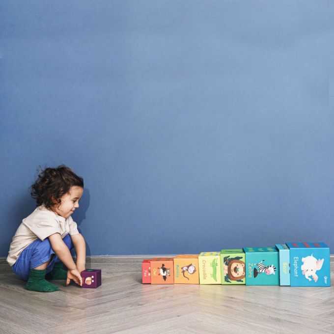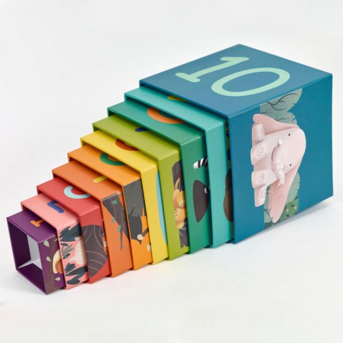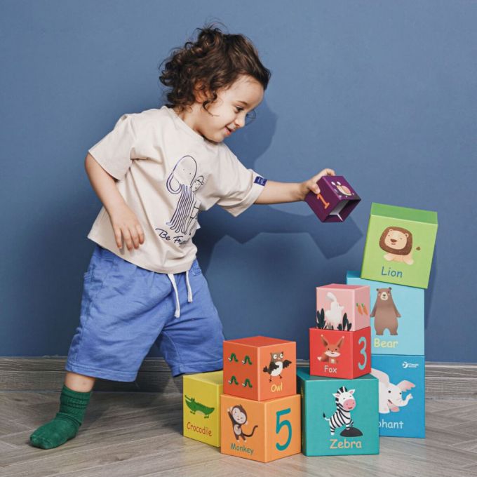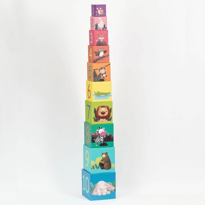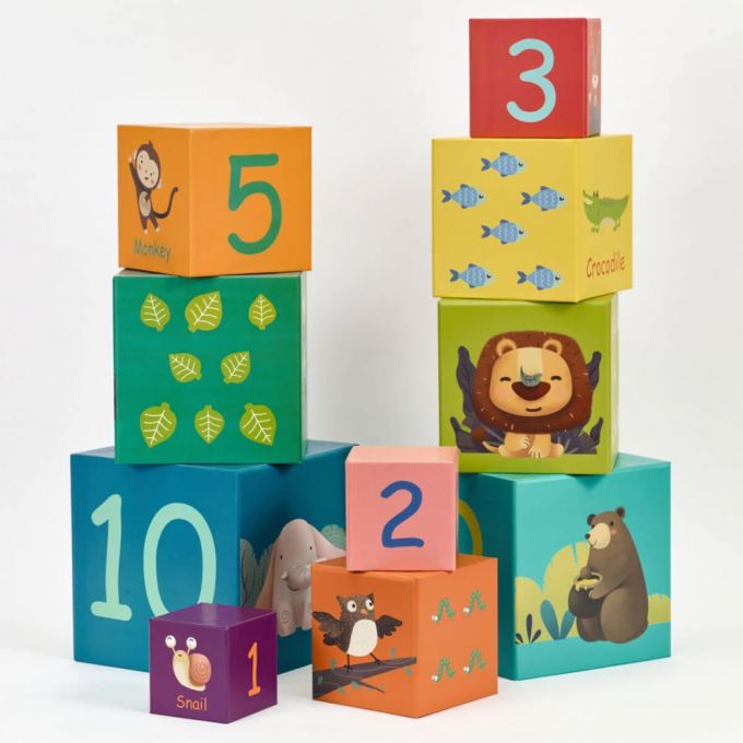 Cubos apilables animales de la selva, son 10 cubos de grueso cartón, con distintos dibujos con animales de la selva, con los que tu peque puede apilar e imaginarse distintas historias mientras aprende los números, los tamaños y desarrolla su equilibrio.