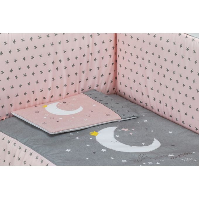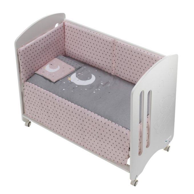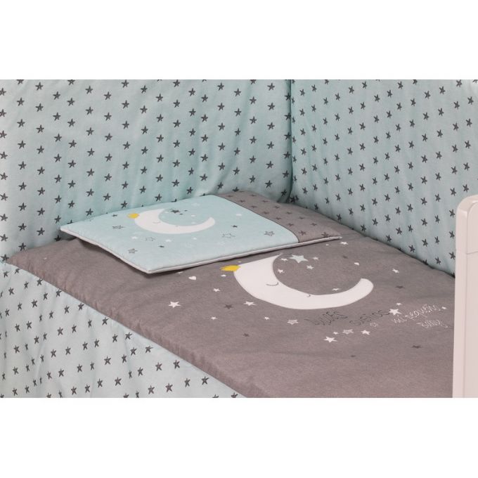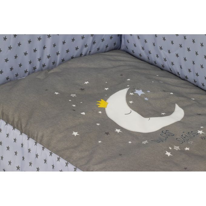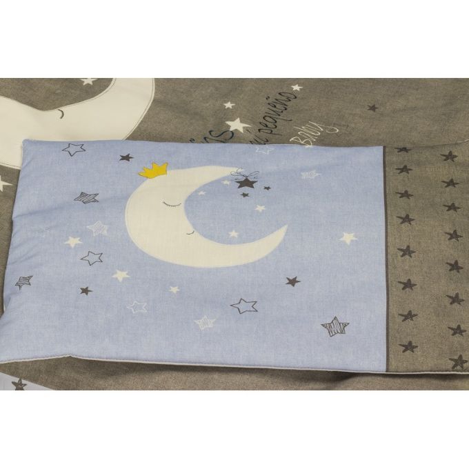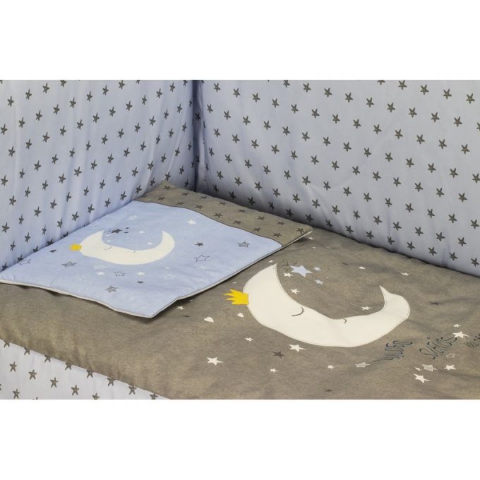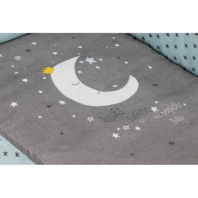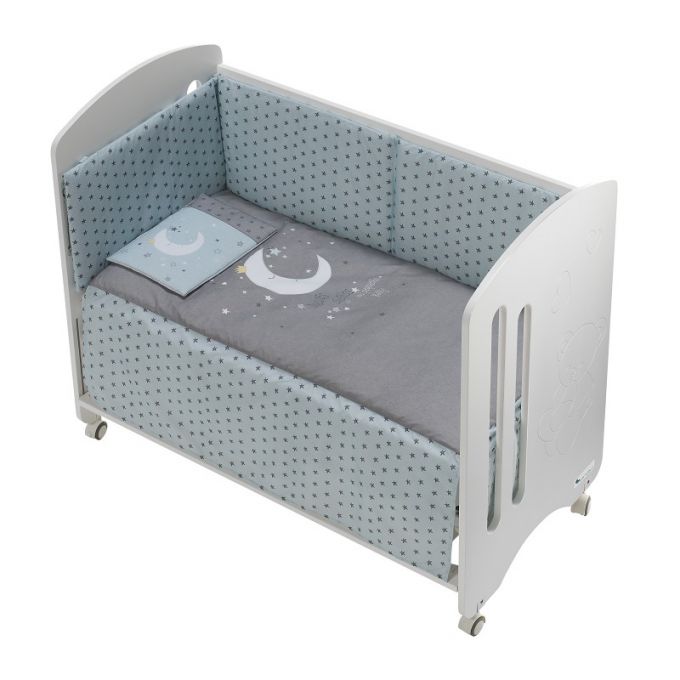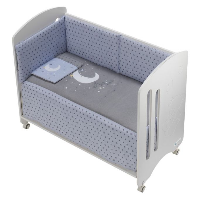 El modelo incluye un coordinado de textiles reversibles para la cuna pertenecientes a la colección Luna Universo en tonos azules, formado por una chichonera y edredón estampados.