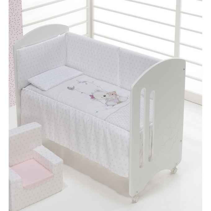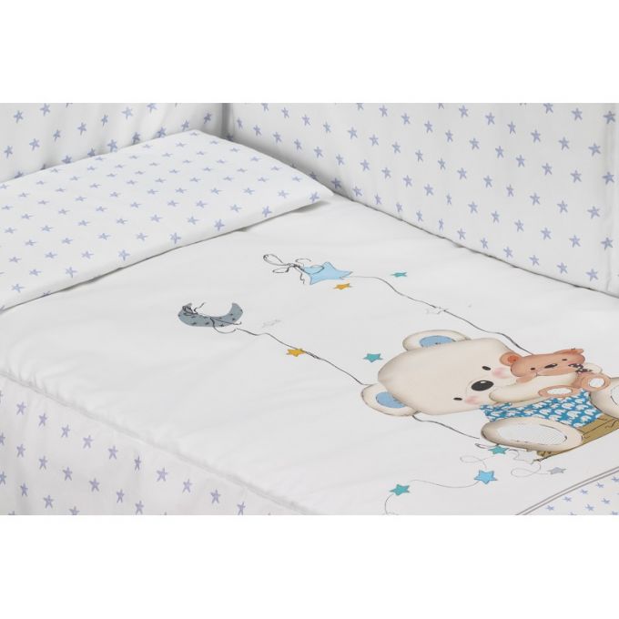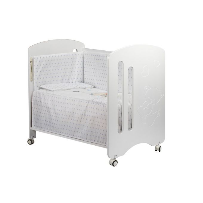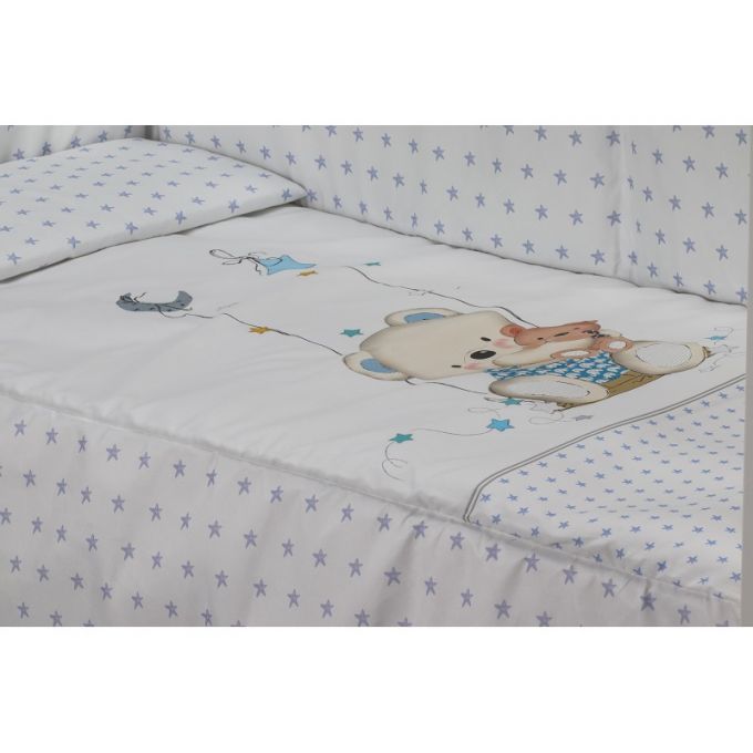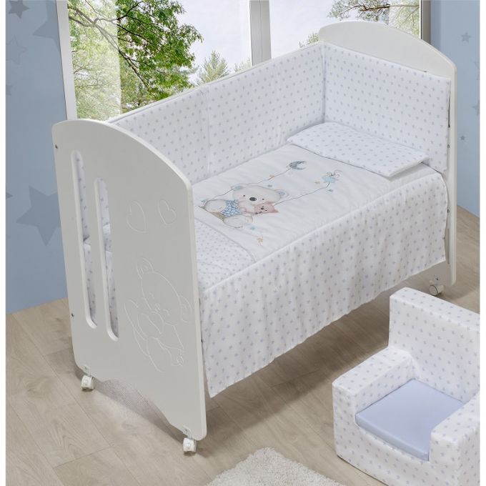 El modelo incluye un coordinado de textiles reversibles para la cuna pertenecientes a la colección Oso Columpio en tonos azules, formado por una chichonera y edredón estampados.