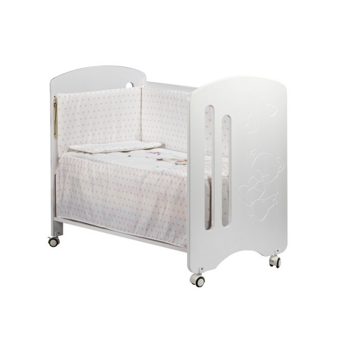 La cuna Lovely Premium tiene como elemento decorativo un osito grabado con corazones en uno de los frontales.