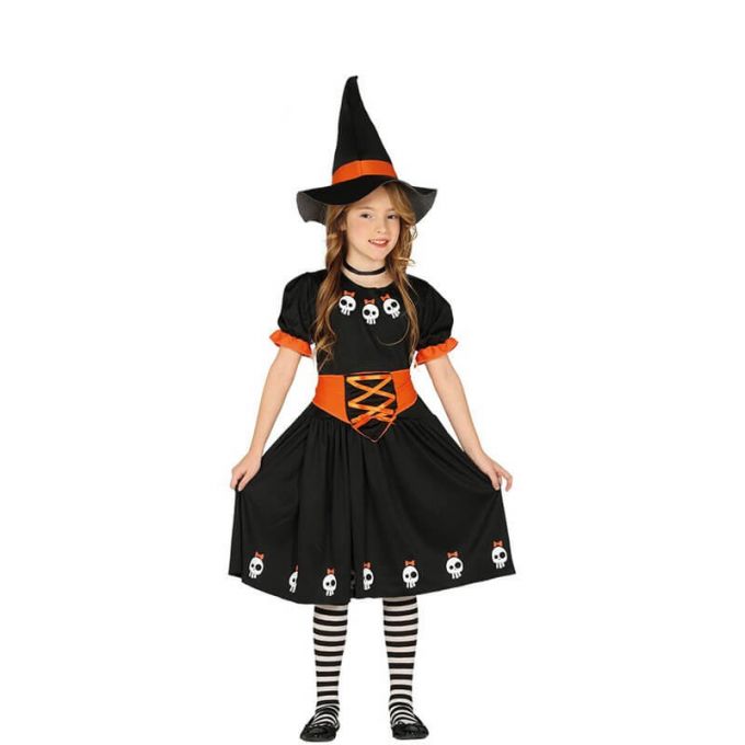 Disfraz de Brujita, Bruja o Hechicera Calaveras para niña. Incluye sombrero y vestido. No incluye medias ni calzado. Perfecto en fiestas del terror como Halloween.