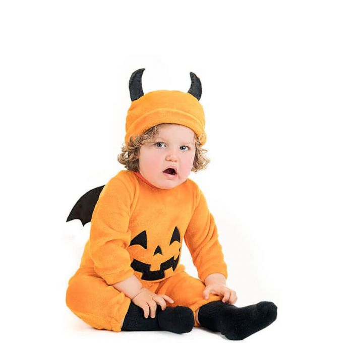 Disfraz de Calabaza para bebé. Incluye gorro con cuernos y mono con alas. No incluye calzado. Perfecto en fiestas de terror como Halloween