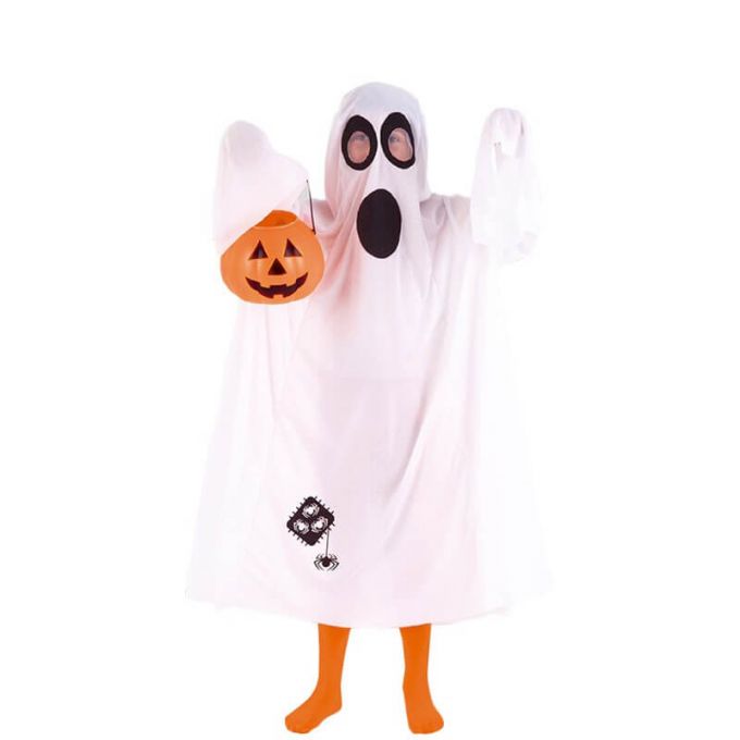 Disfraz de Fantasma o Espectro Blanco con Araña para niños. Incluye túnica con máscara. No incluye calabaza ni medias. Perfecto en fiestas del terror como Halloween.