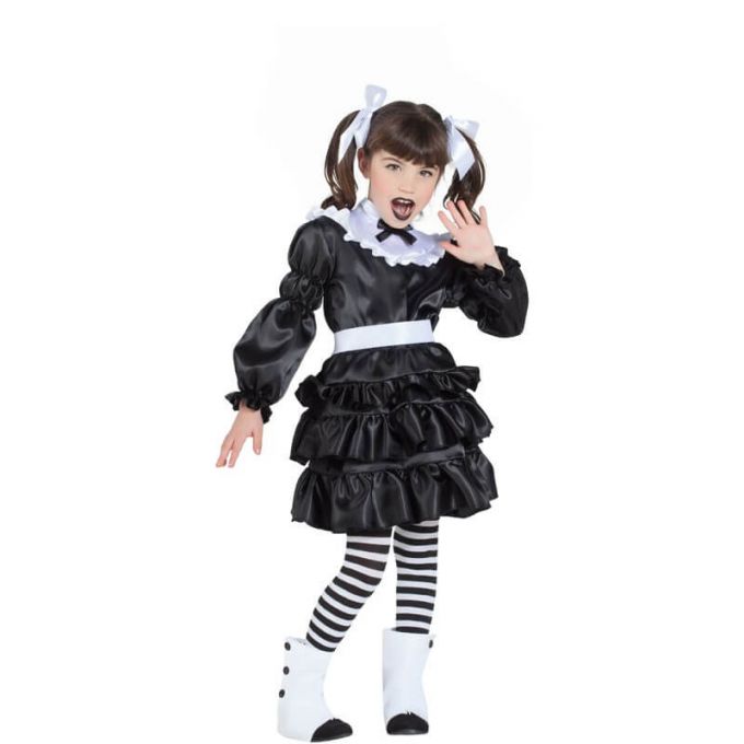 Disfraz de Lolita Gótica para niña. Incluye vestido, cinturón, medias, cubrebotas y lazos para el pelo. No incluye calzado. Perfecto en fiestas de terror como Halloween.