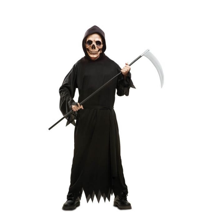 Disfraz de Muerte, Ejecutor o Parca Tenebrosa para niño. Incluye túnica con capucha y cinturón. No incluye calzado, mascara ni guadaña. Ideal en fiestas de terror como Halloween.