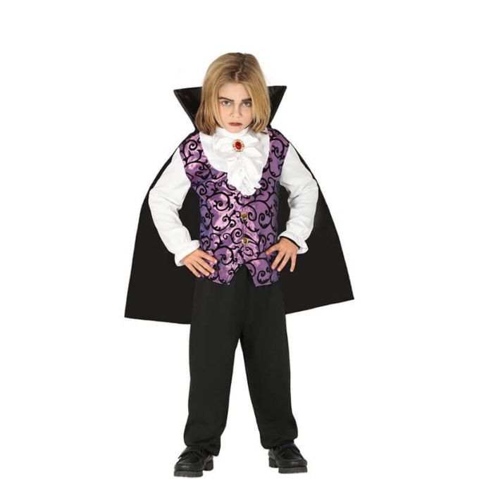 Disfraz de Vampiro o Conde Drácula Elegante Lila para niño. Incluye capa, camisa con chaleco y pantalón. No incluye calzado. Perfecto