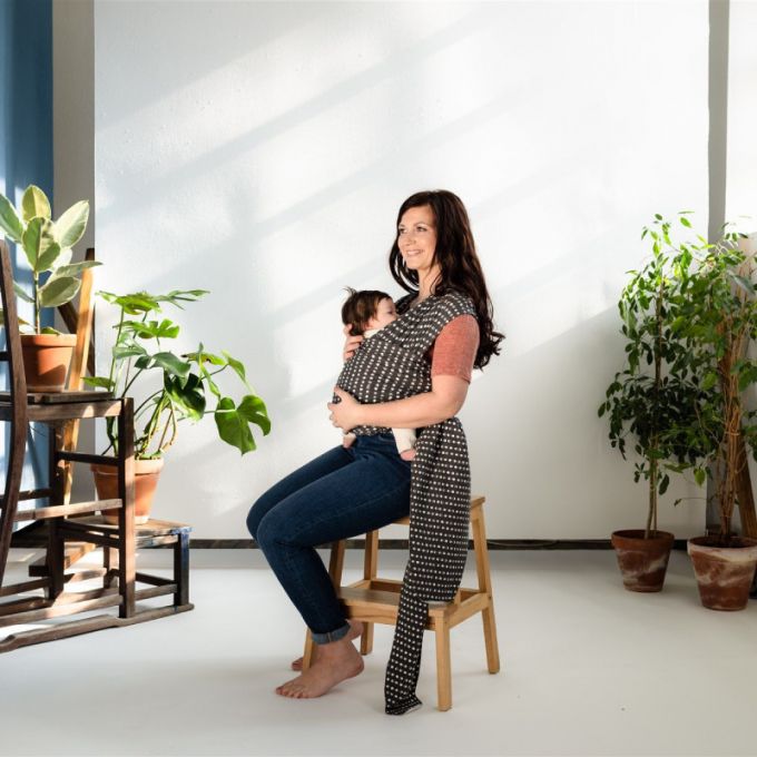 ¡Muy fácil de utilizar! Para todo tipo de papás y mamás pues se realiza un sencillo nudo de base (preanudado) y luego se coloca al bebé sin necesidad de quitarse el fular.