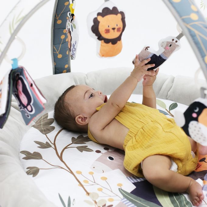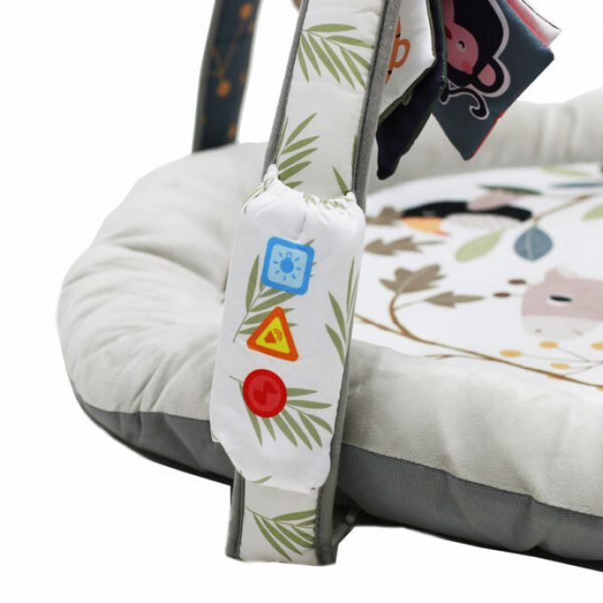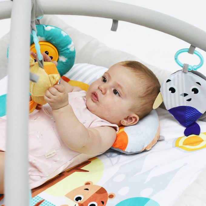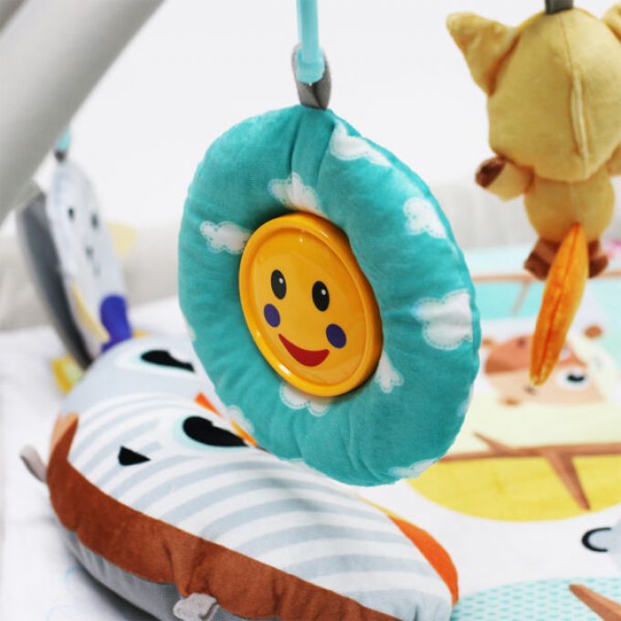 Su arco de juego está equipado con 5 peluches animados diferentes con sonido. Además, dispone de una cajita musical con 8 melodías diferentes. Todo ello hace que este gimnasio de actividades estimule las 5 sentidos del bebé y contribuya en sus habilidades cognitivas y motoras, tanto motricidad gruesa (alcanzar o golpear), como motricidad fina (destreza y coordinación).