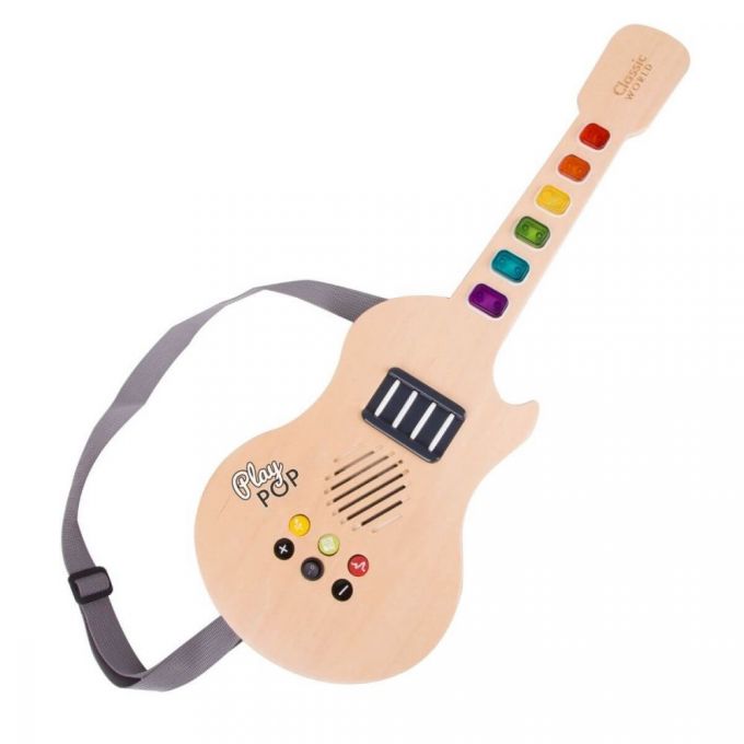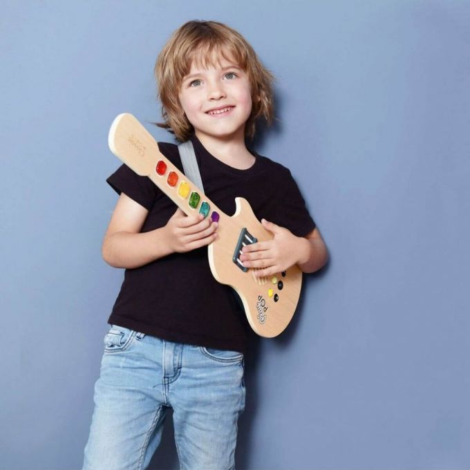 La guitarra electrica es una guitarra electrica con una bonita superficie de madera. Las teclas de colores en el mástil pueden crear diferentes notas cuando los niñ@s los tocan y ajustar su volumen y crear distintos efectos con el resto de botones que hay en la caja.