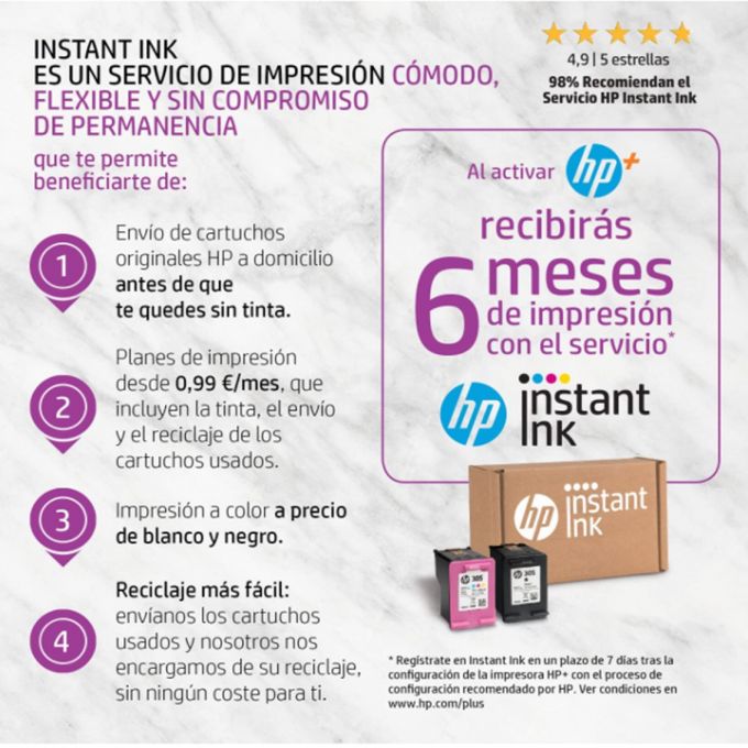 Nunca más te quedes sin tinta con Instant Ink. Recibe tu Tinta HP en casa, antes de que se agote, con reciclaje incluido y sin que tengas que preocuparte de nada. Desde solo 0,99 al mes. Regístrate en Instant Ink para obtener tinta y disfruta de la entrega a domicilio y el reciclaje de los cartuchos usados ahorrando hasta un 70 %.