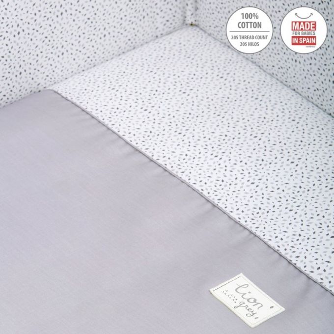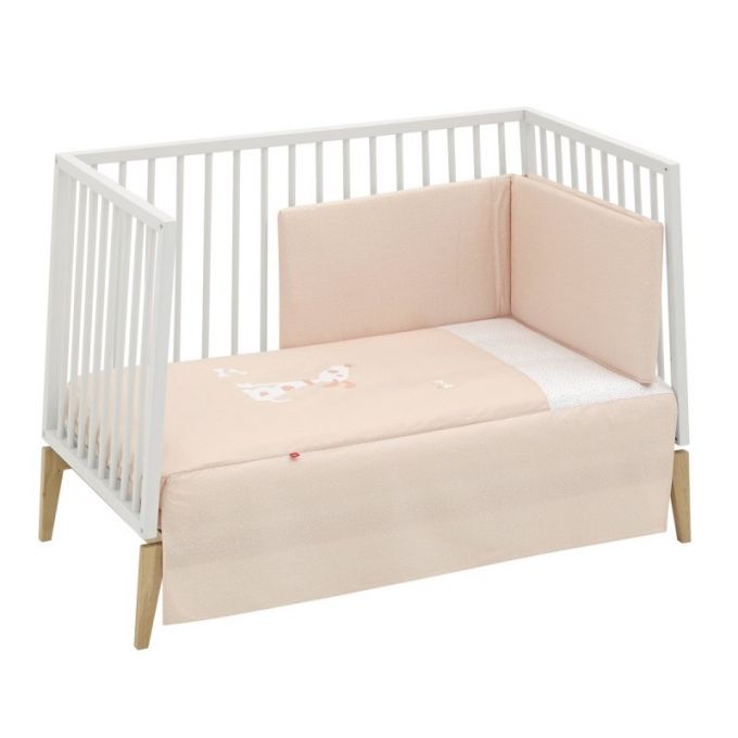 Dispone de 3 volantes que cumplen la función de vestir la cuna. El protector fabricado con tejido cuyo interior va acolchado con fibra hueca, amortigua los posibles golpes del bebe contra la cuna.