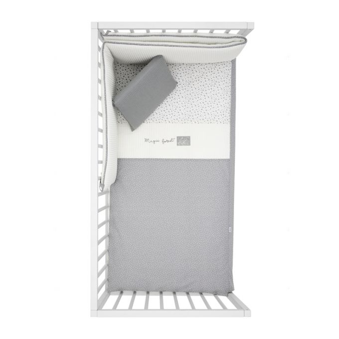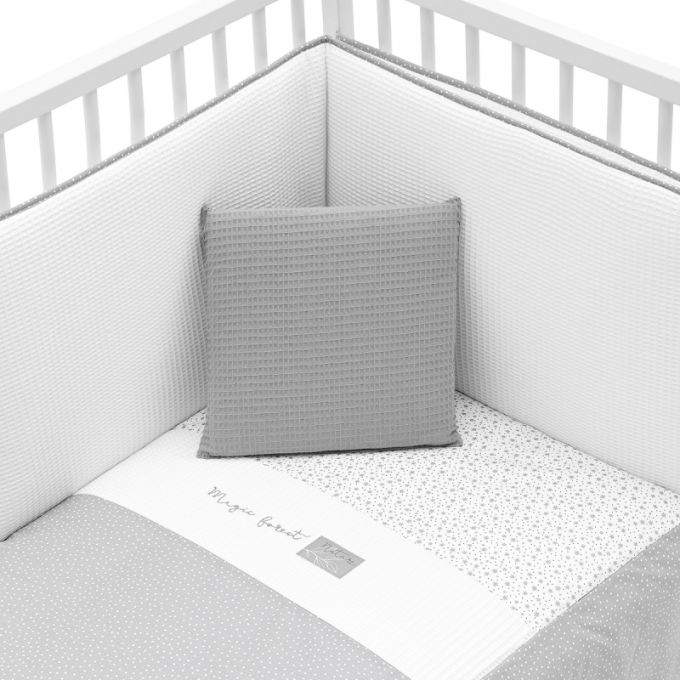 Juego de 2 piezas para vestir la cuna, compuesto por colcha invierno/verano más protector incluye un bonito cojín bordado. La colcha, es la prenda que viste la cuna y cumple el cometido de protección contra el frío como si de una manta o una funda nórdica se tratara. Su cualidad de tener un relleno desenfundable la convierte en una prenda versátil para ser utilizada en invierno y en verano y también ofrece la ventaja de ser lavada con facilidad.