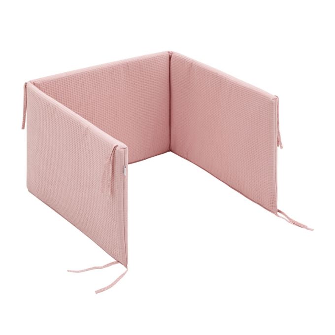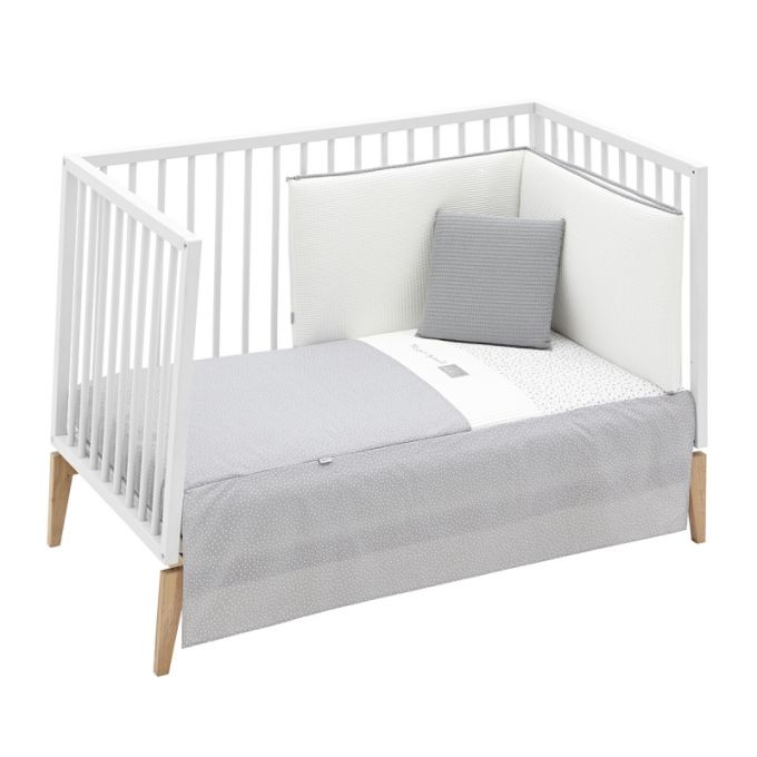 Dispone de 3 volantes que cumplen la función de vestir la cuna. El protector fabricado con tejido cuyo interior va acolchado con fibra hueca, amortigua los posibles golpes del bebe contra la cuna.