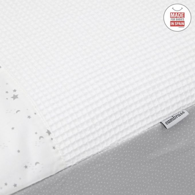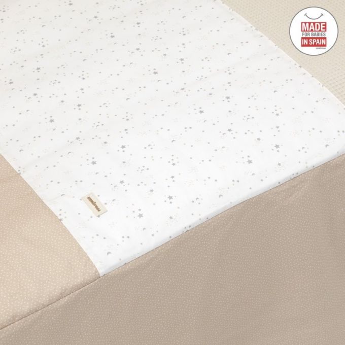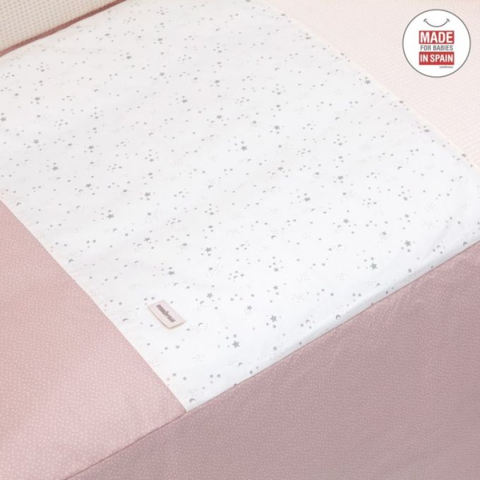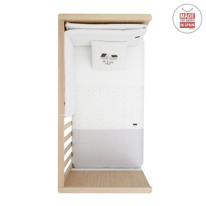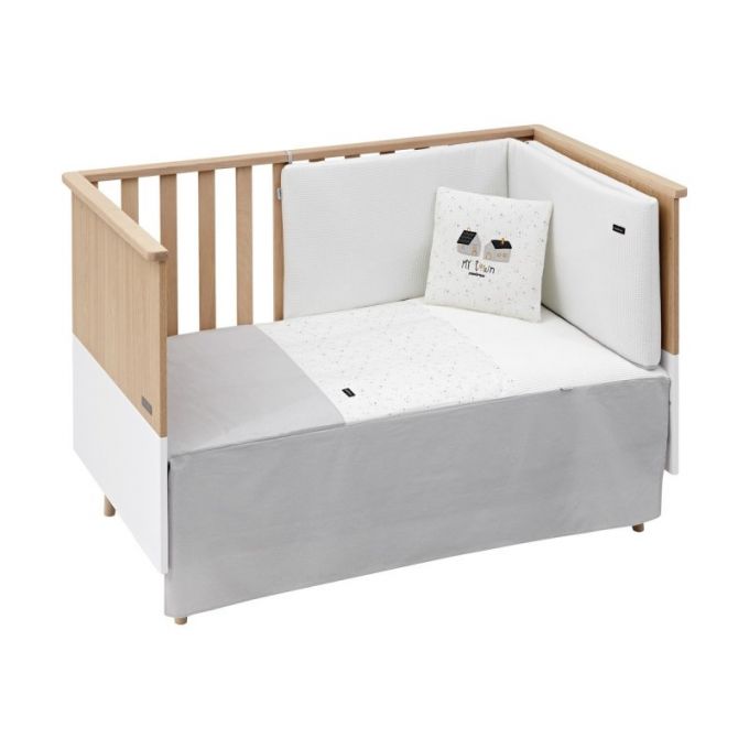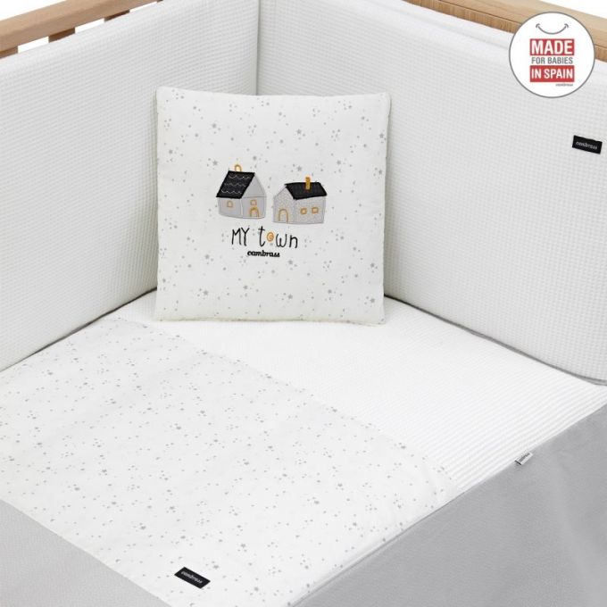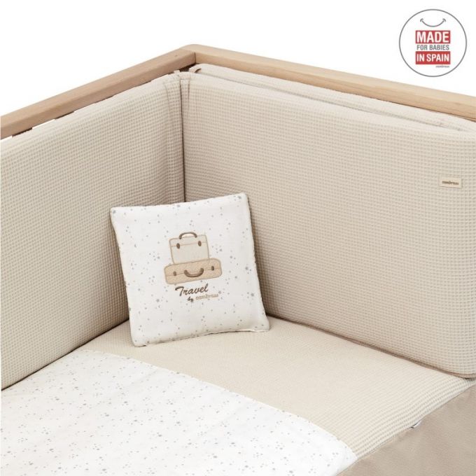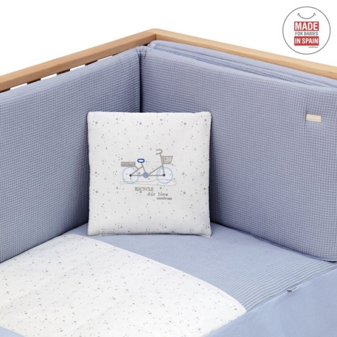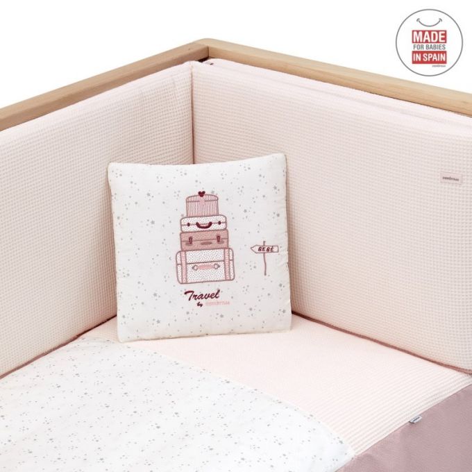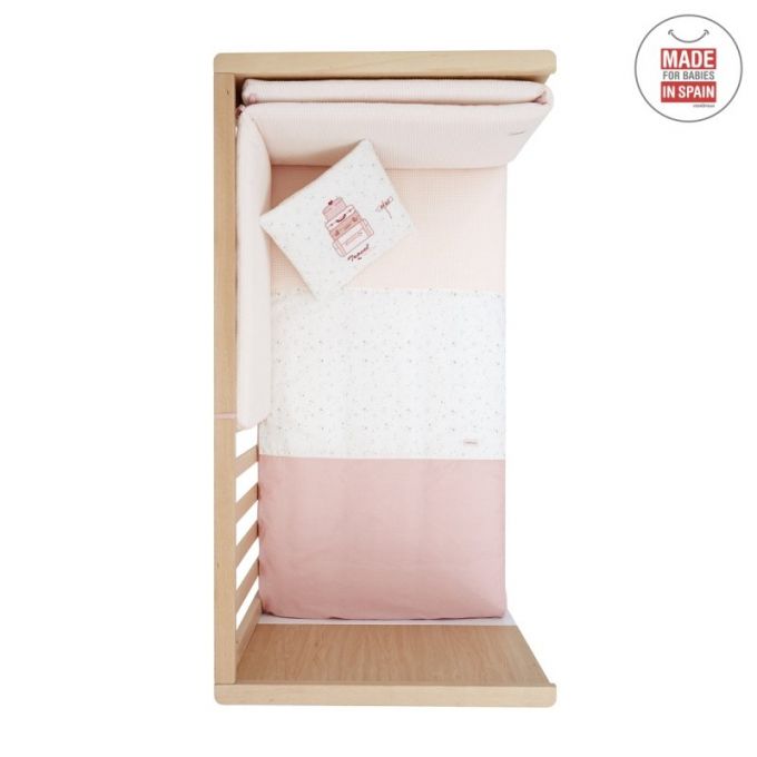 Juego de 2 piezas para vestir la cuna, compuesto por colcha invierno/verano más protector incluye un bonito cojín bordado. La colcha, es la prenda que viste la cuna y cumple el cometido de protección contra el frío como si de una manta o una funda nórdica se tratara. Su cualidad de tener un relleno desenfundable la convierte en una prenda versátil para ser utilizada en invierno y en verano y también ofrece la ventaja de ser lavada con facilidad.