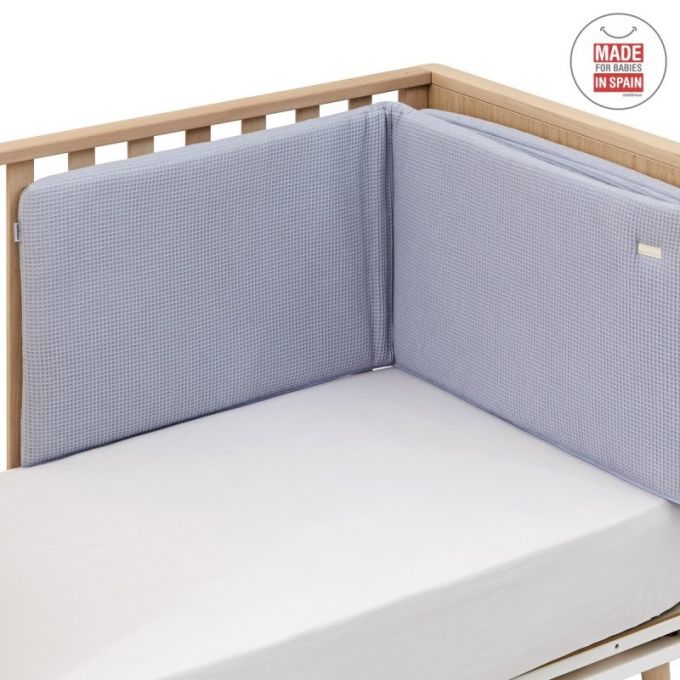Dispone de 3 volantes que cumplen la función de vestir la cuna. El protector fabricado con tejido cuyo interior va acolchado con fibra hueca, amortigua los posibles golpes del bebe contra la cuna.